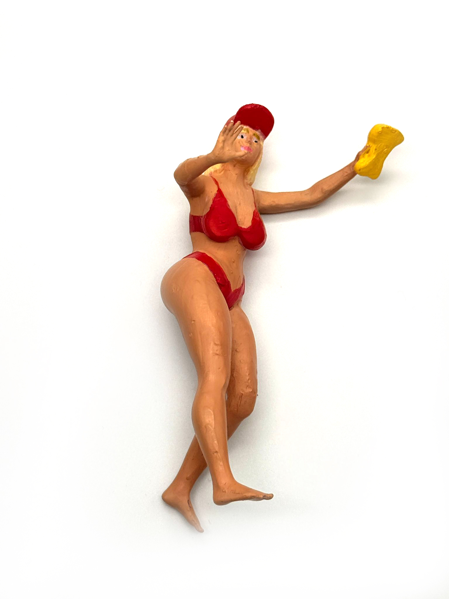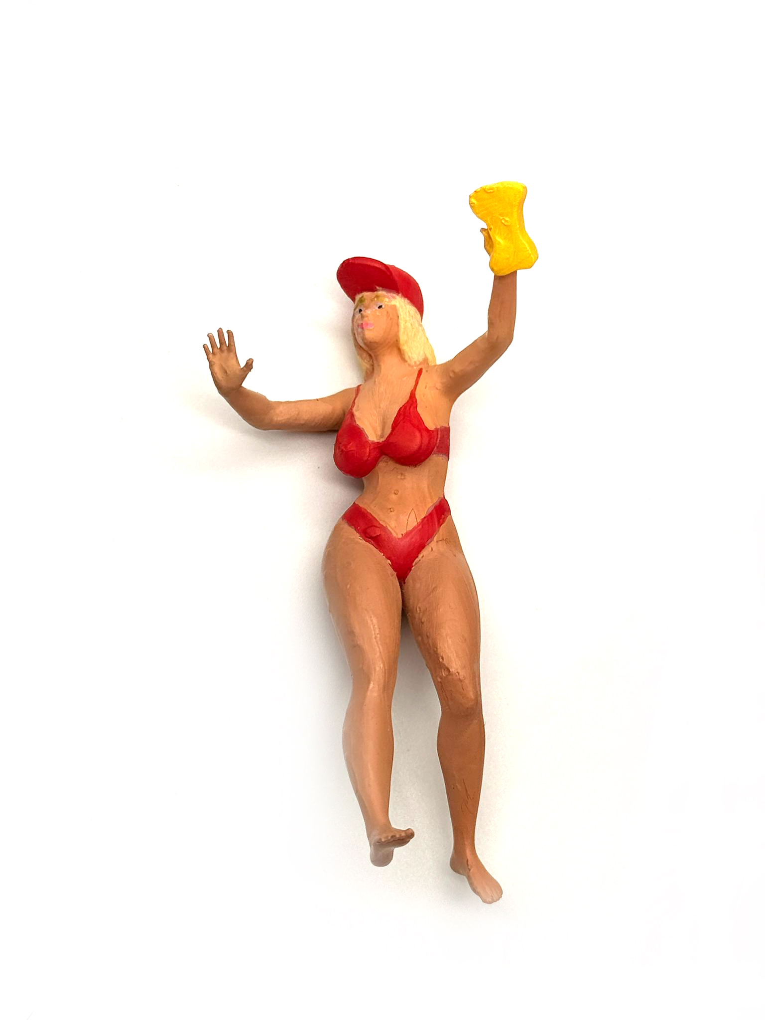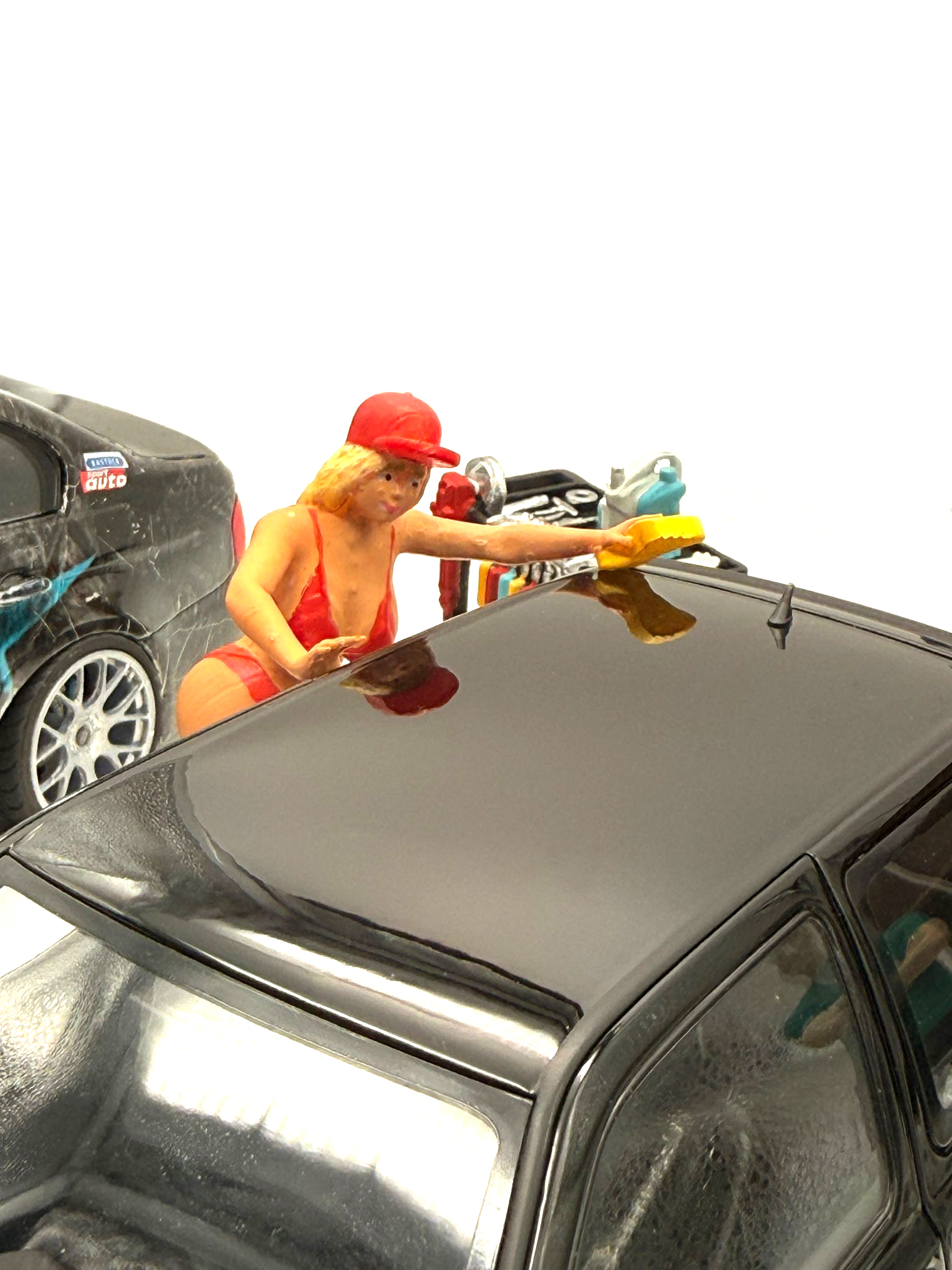 Die Pose ist dynamisch – eine Frau mit Waschschwamm und Basecap – ideal als Blickfang neben Modellautos in der Vitrine oder als Szene in einem Car-Wash-Setup.