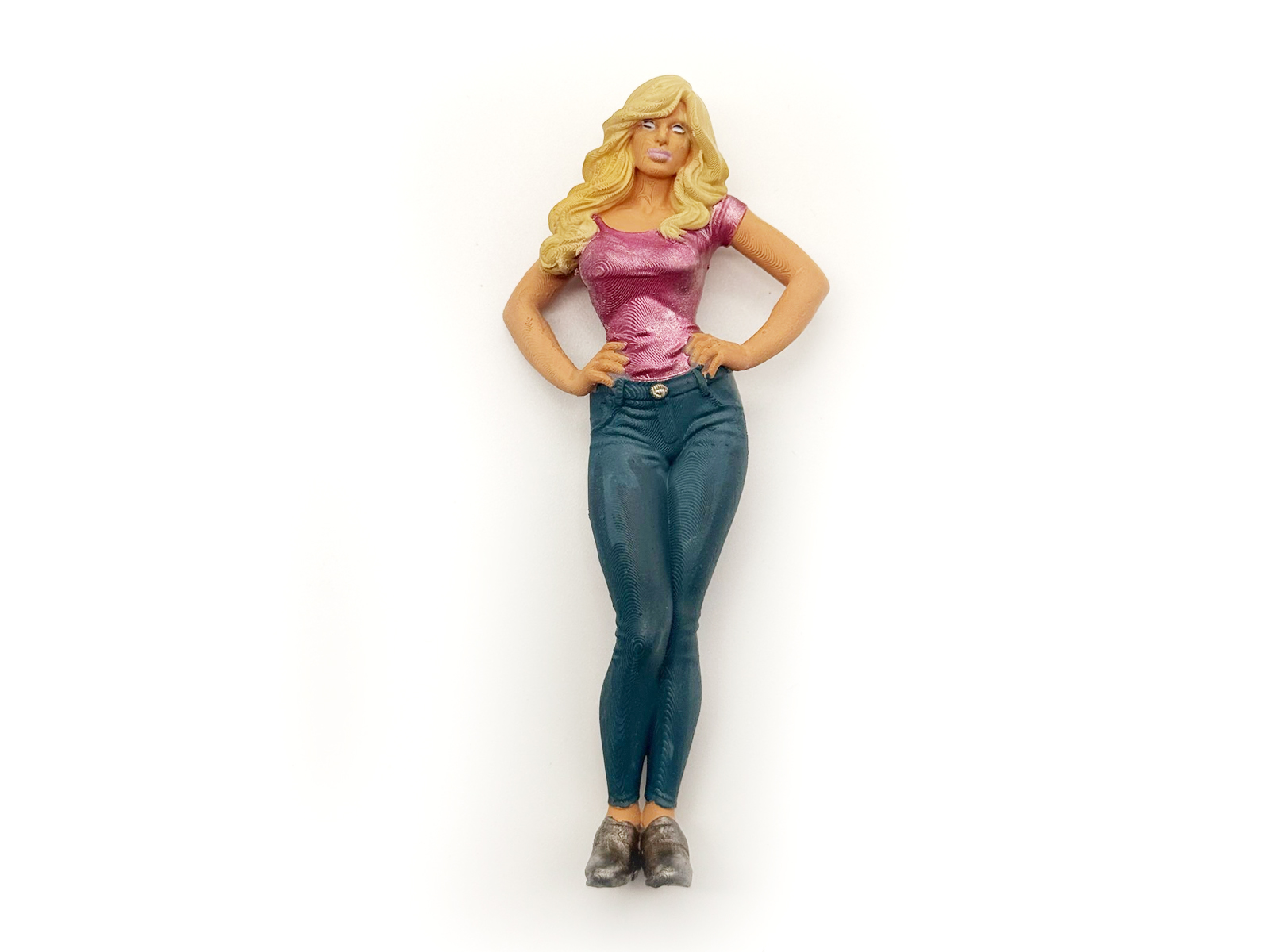 Diese 1:18 Resin-Figur zeigt eine selbstbewusst stehende Frau mit eng anliegendem T-Shirt und figurbetonter Jeans. Die Pose eignet sich ideal für Tuning-, Szene-, Urban- und Modellauto-Dioramen, in denen eine moderne weibliche Figur als Ergänzung oder Blickfang platziert werden soll.