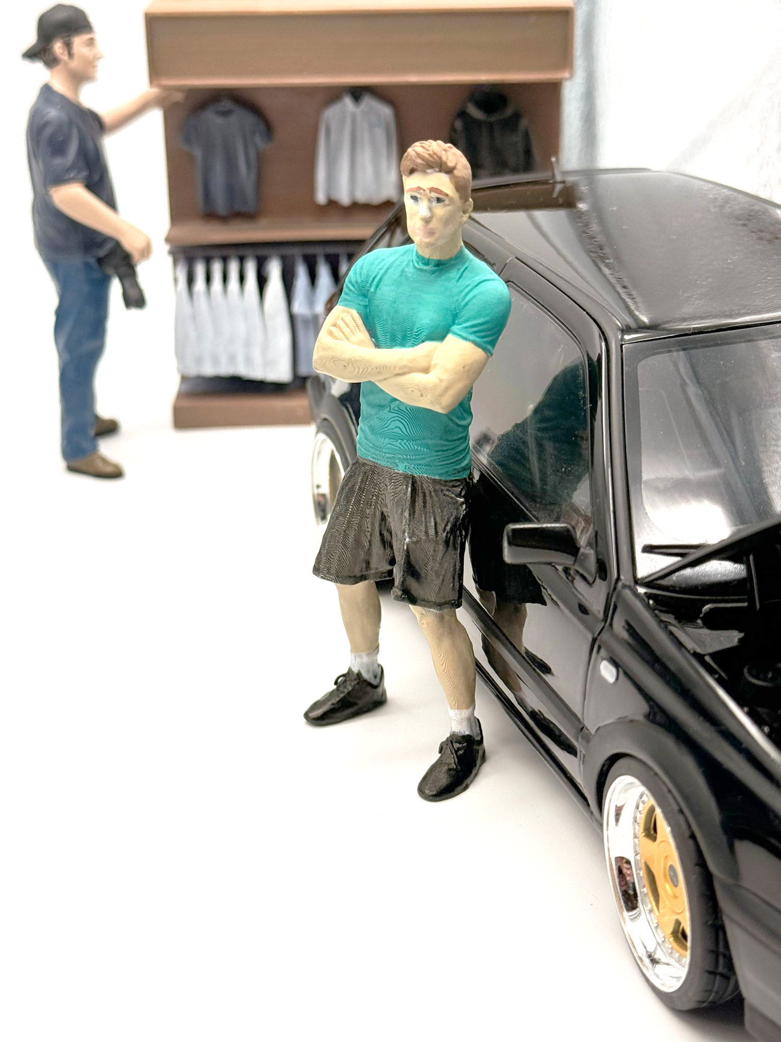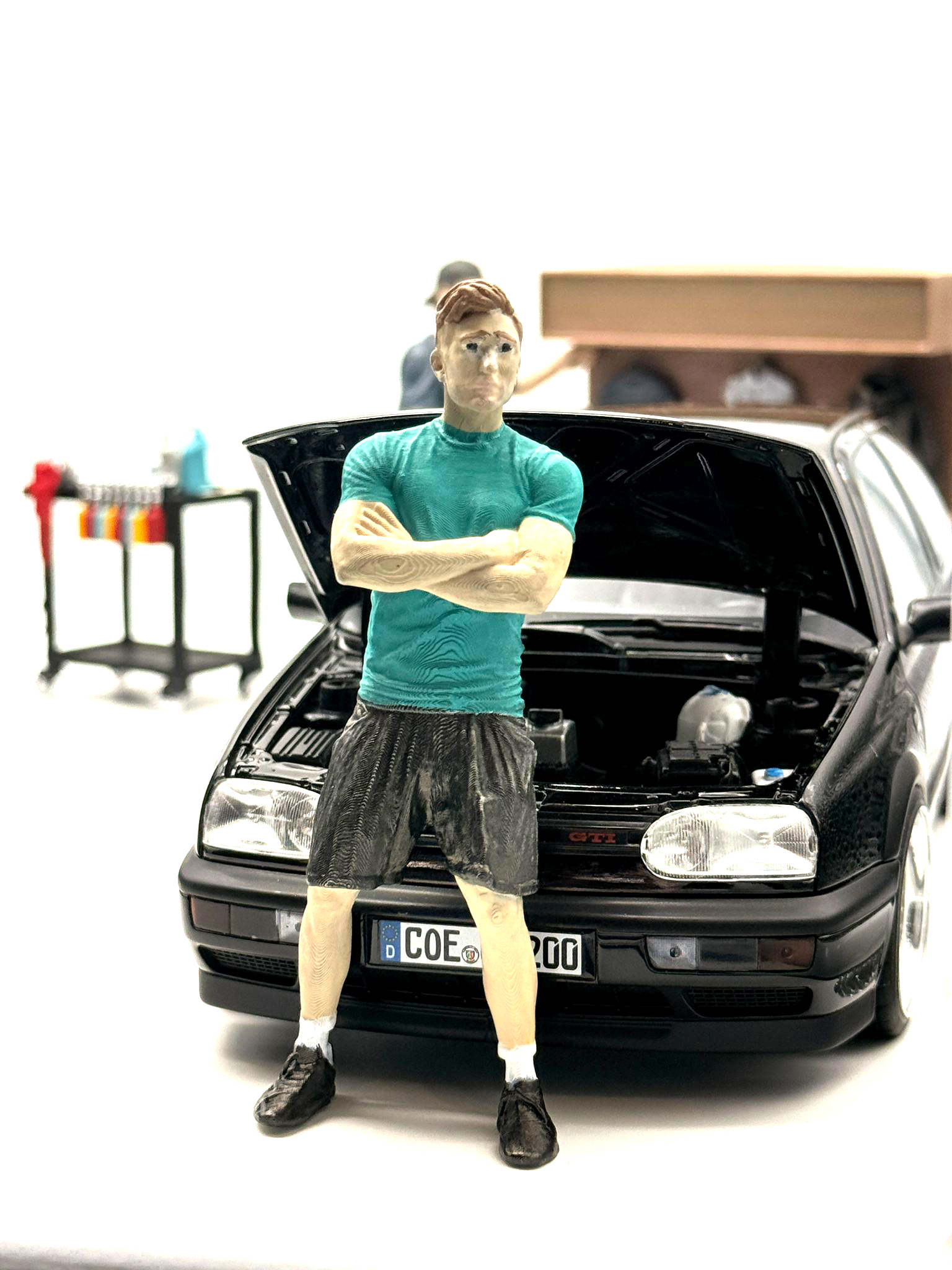 Diese unbemalte 1:18 Resin-Figur ist die perfekte Ergänzung für jedes Diorama im Bereich Werkstatt, Show & Shine oder Tuning-Szenerien.