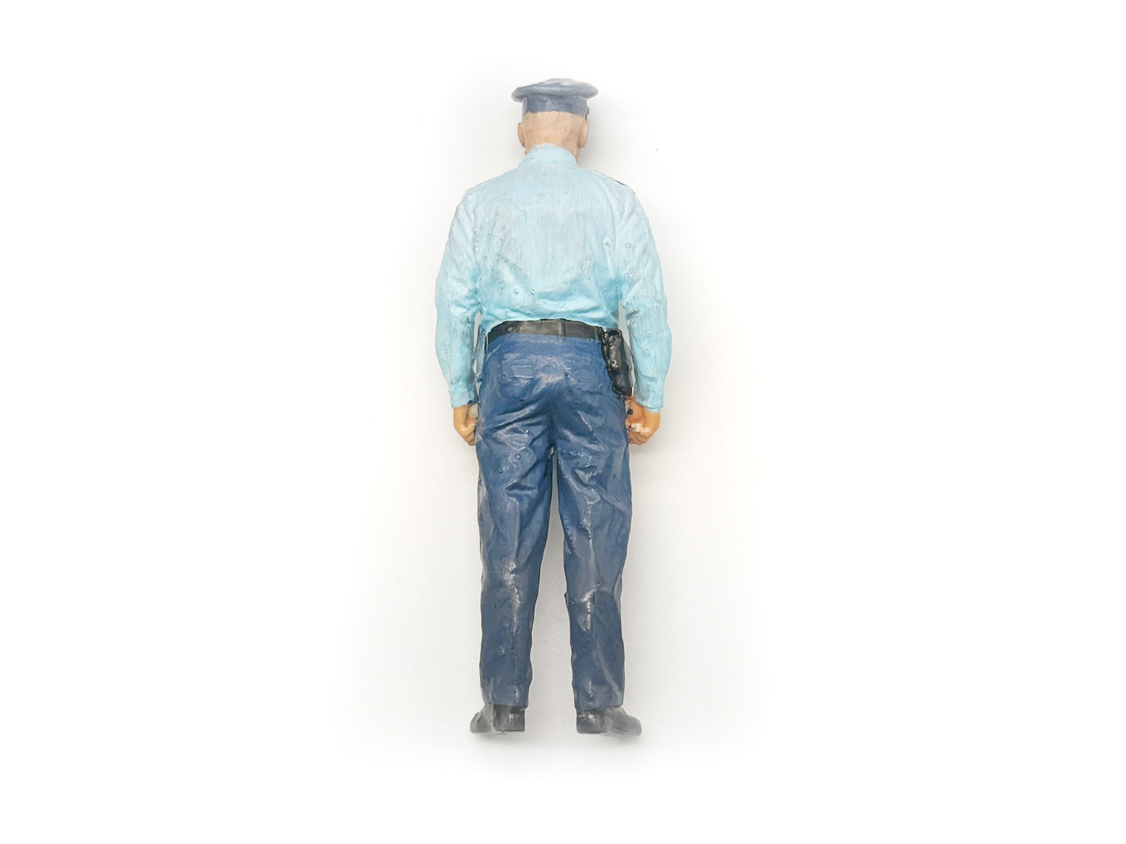 Mit typischer Polizeiuniform, Einsatzgürtel und Funkgerät lässt sich die Figur realistisch in Modellbau-Umgebungen integrieren.