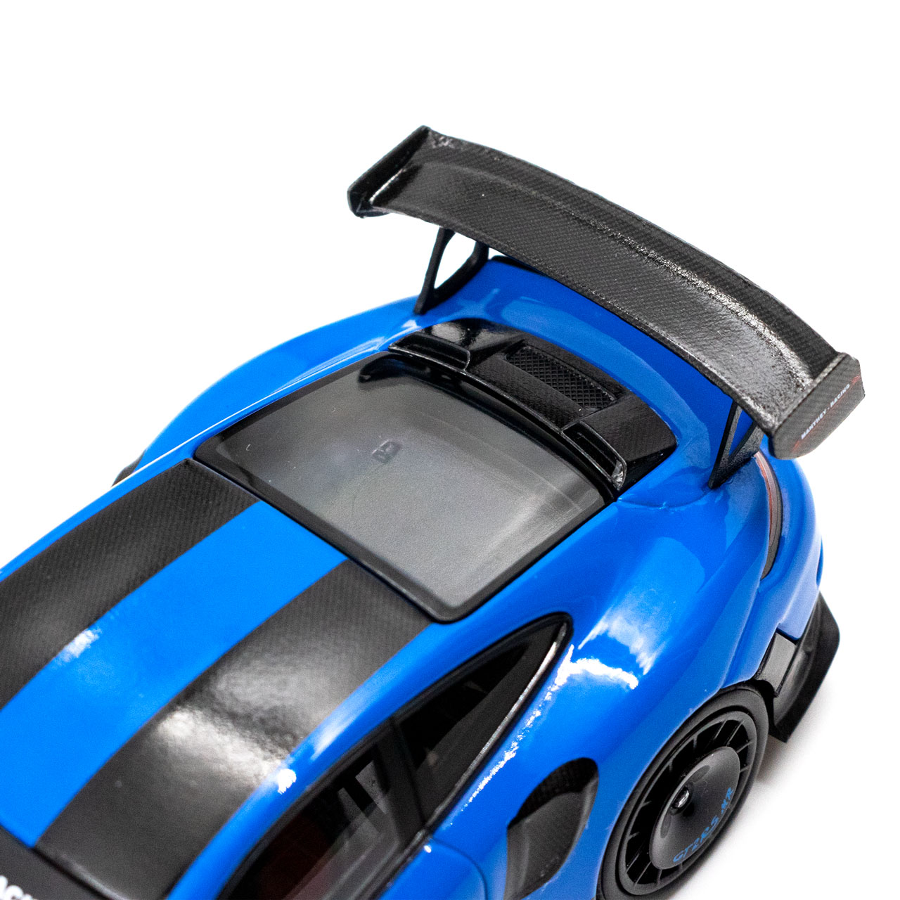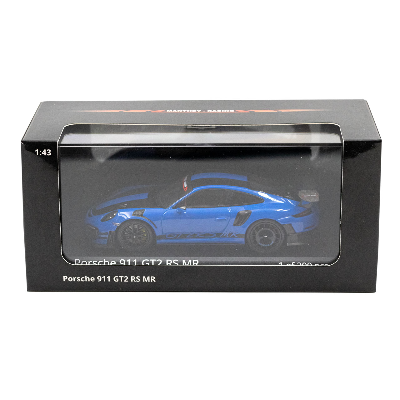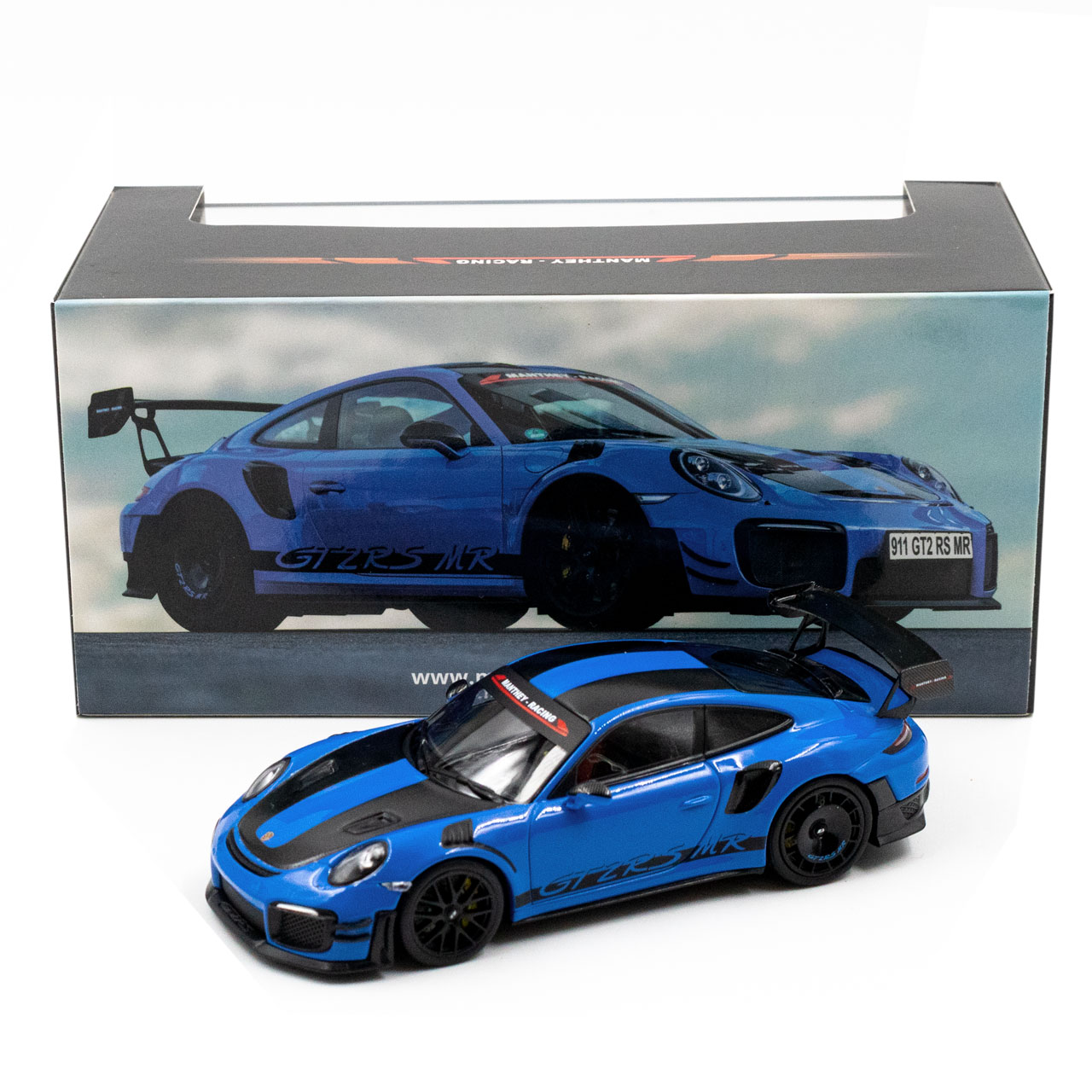 Das Manthey-Racing Porsche 911 GT2 RS MR Modell im Maßstab 1:43 in blau mit schwarzem Decor