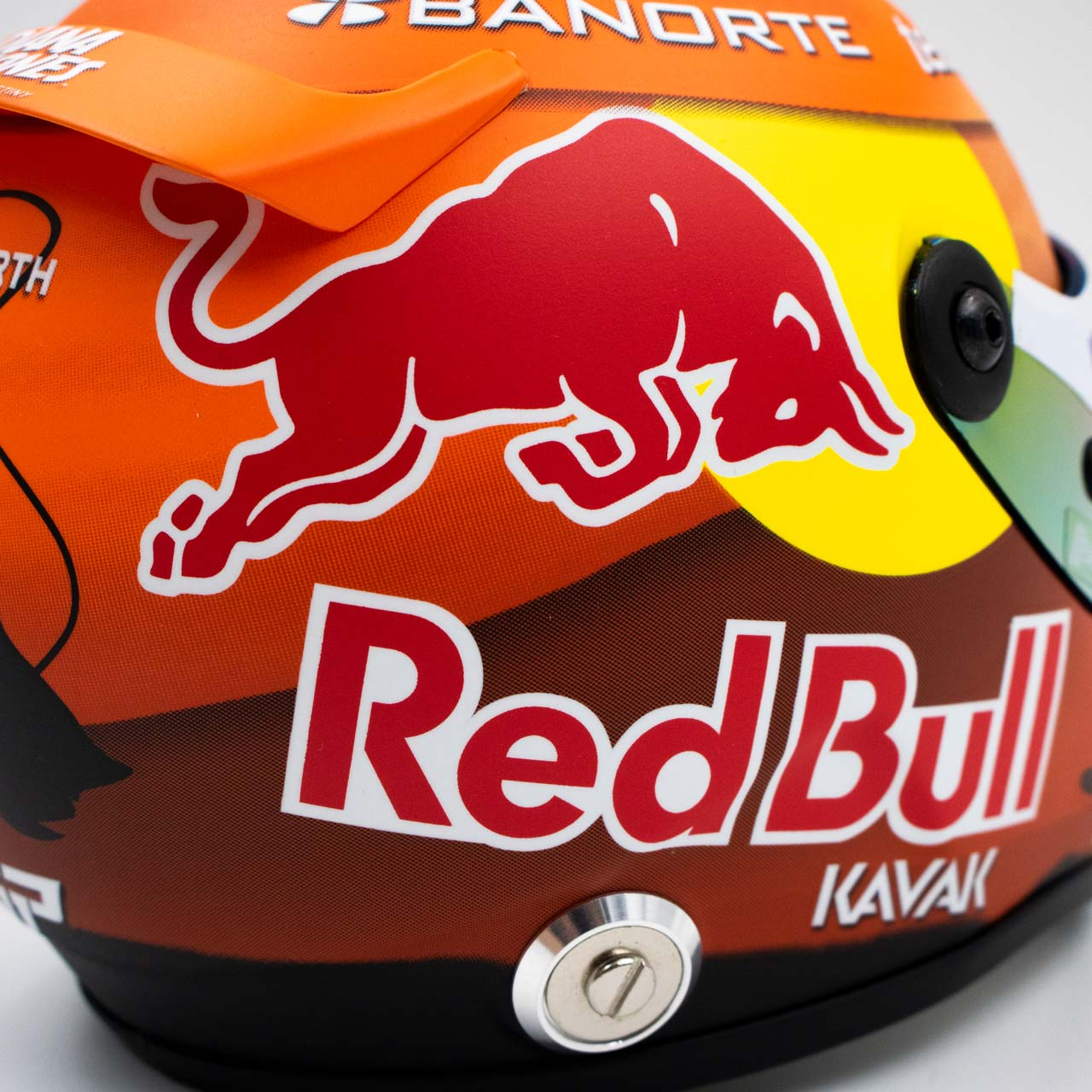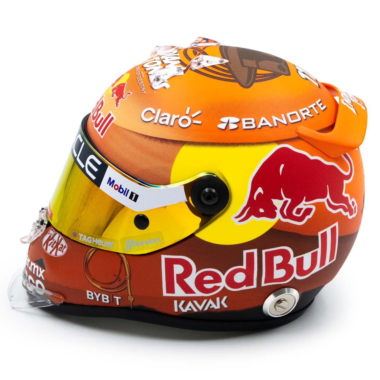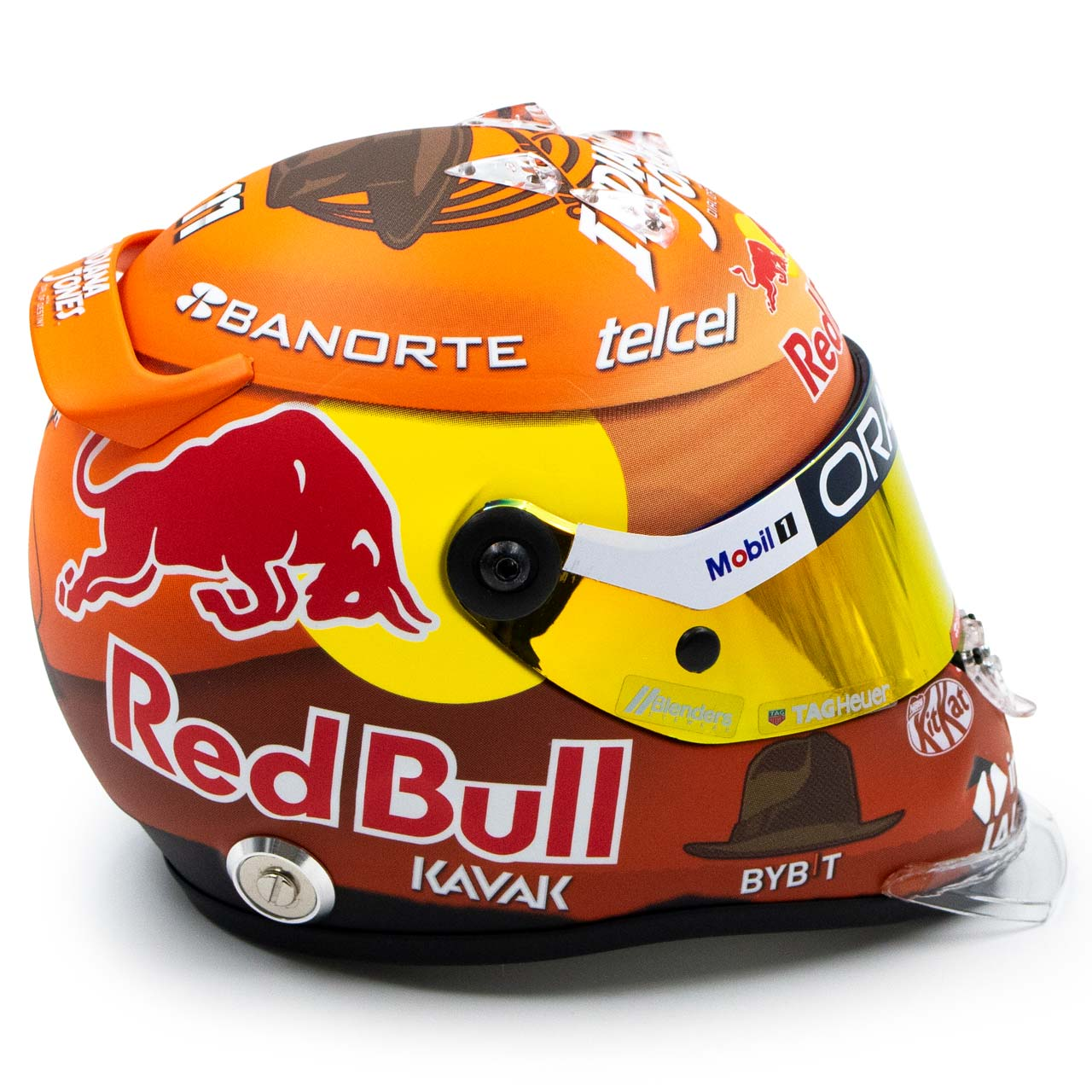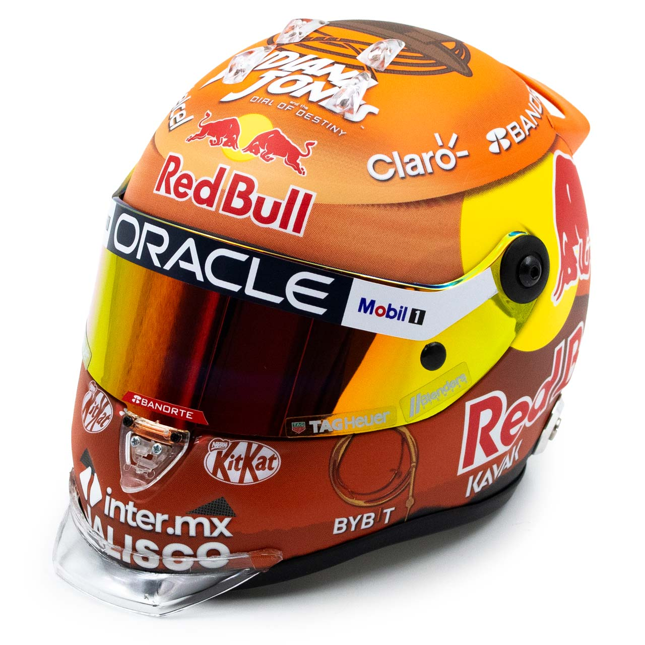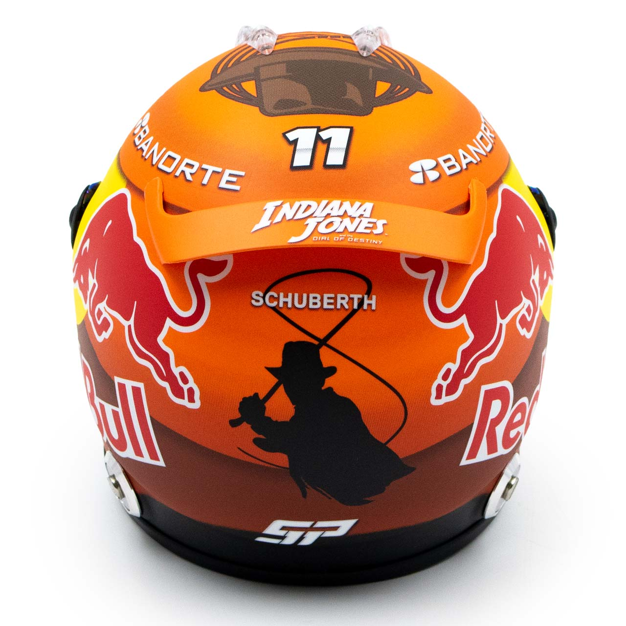 Der Miniaturhelm im Maßstab 1:2 ist eine originalgetreue Nachbildung des Fahrerhelms von Sergio Pérez vom Oracle Red Bull Racing Team aus der Formel 1 Saison 2023, den er während des Großen Preis von Kanada trug. Das Design ist an den fünften Teil der Indianer Jones Filmreihe angelehnt, welcher zum Zeitpunkt des Rennens in Kanada veröffentlicht wurde.