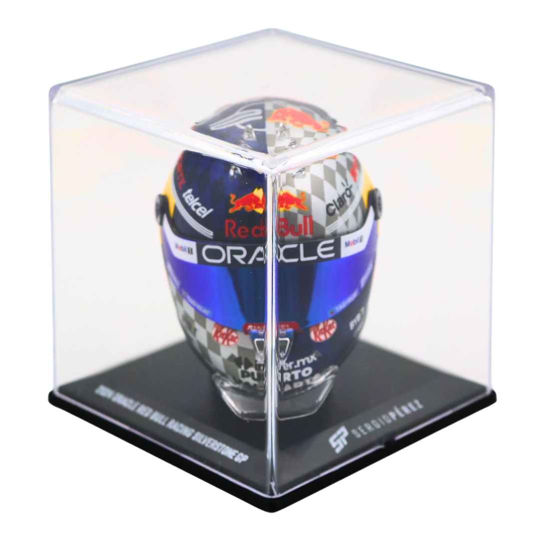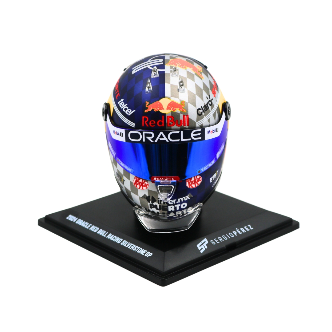 Der Miniaturhelm im Maßstab 1:4 ist eine originalgetreue Nachbildung des Fahrerhelms von Sergio Pérez vom Oracle Red Bull Racing Team aus der Formel 1 Saison 2024, den er während des Großen Preis von Großbritannien in Silverstone trug.