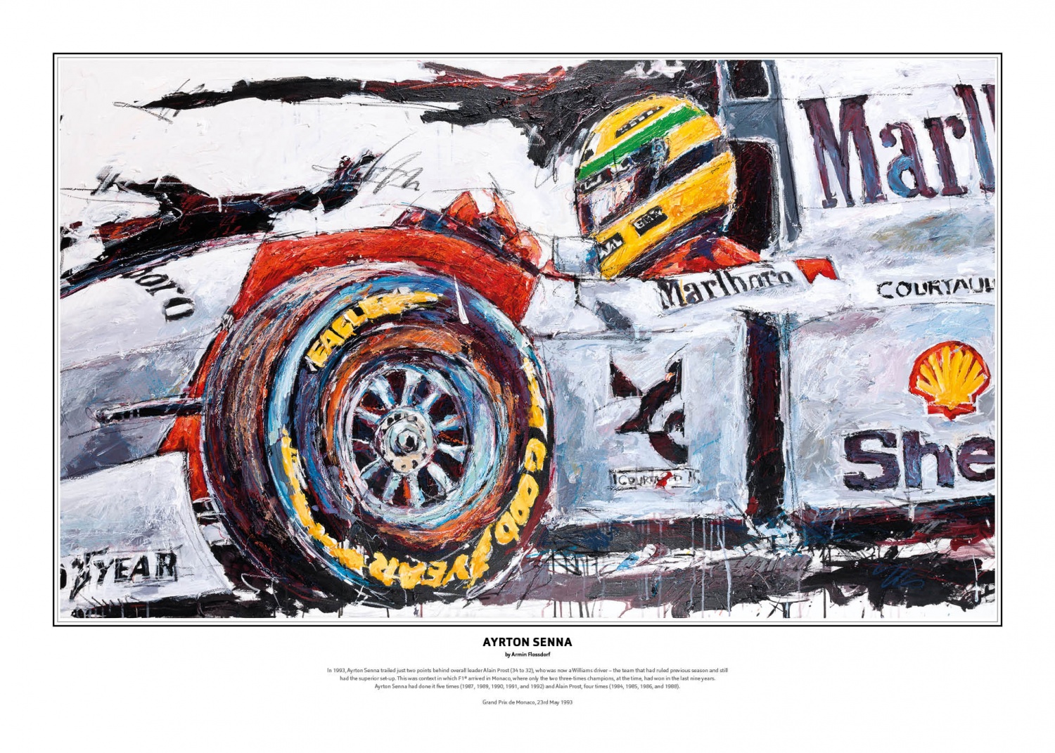 Ayrton Senna im McLaren MP4/8 1993 von Armin Flossdorf. Kunstdruck signiert vom Künstler und limitiert auf 161 Stück.