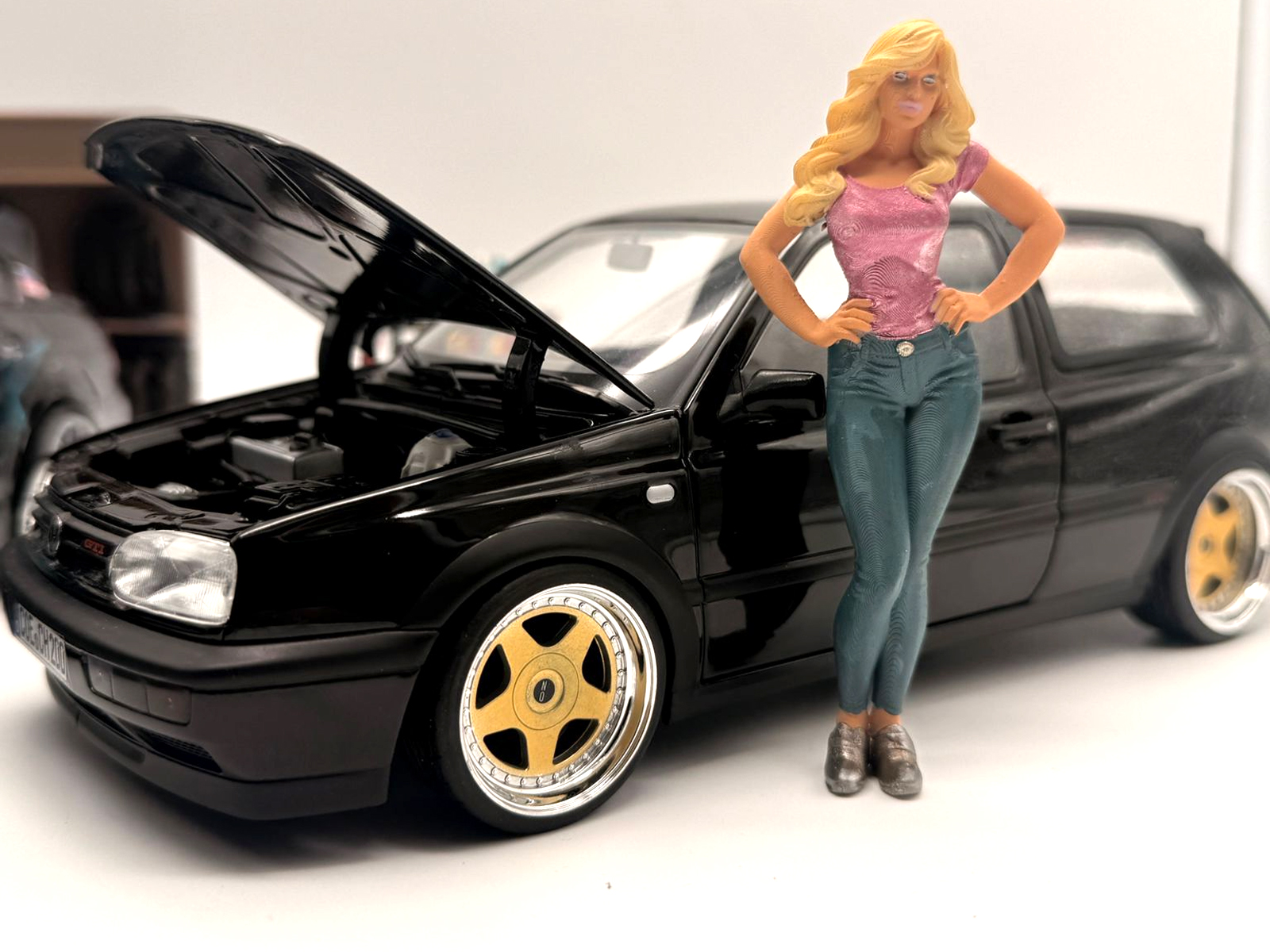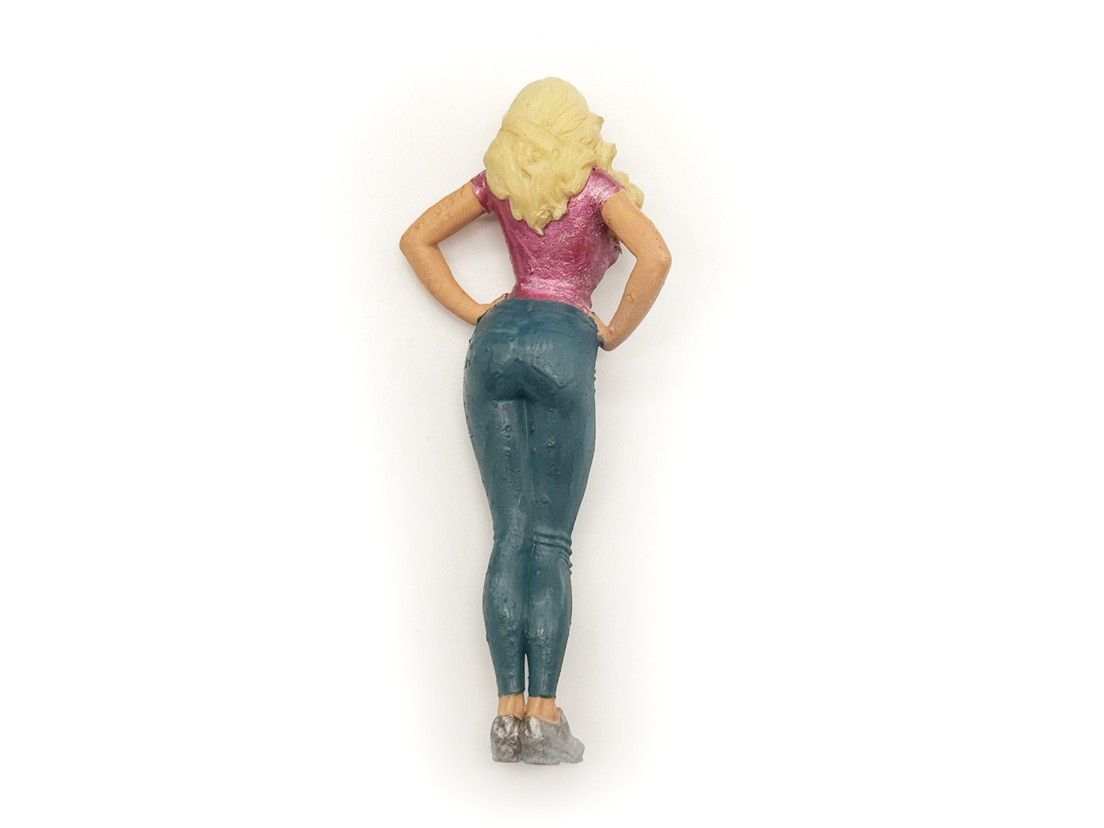 Diese 1:18 Resin-Figur zeigt eine selbstbewusst stehende Frau mit eng anliegendem T-Shirt und figurbetonter Jeans. Die Pose eignet sich ideal für Tuning-, Szene-, Urban- und Modellauto-Dioramen, in denen eine moderne weibliche Figur als Ergänzung oder Blickfang platziert werden soll.