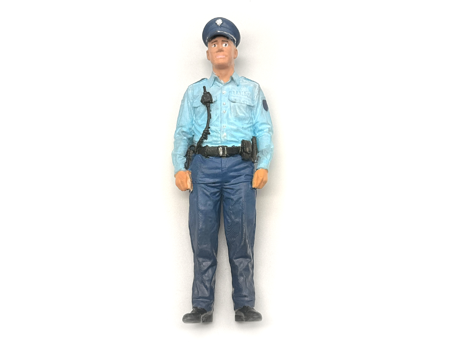 Mit typischer Polizeiuniform, Einsatzgürtel und Funkgerät lässt sich die Figur realistisch in Modellbau-Umgebungen integrieren.