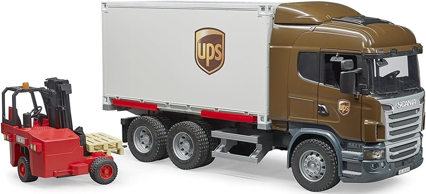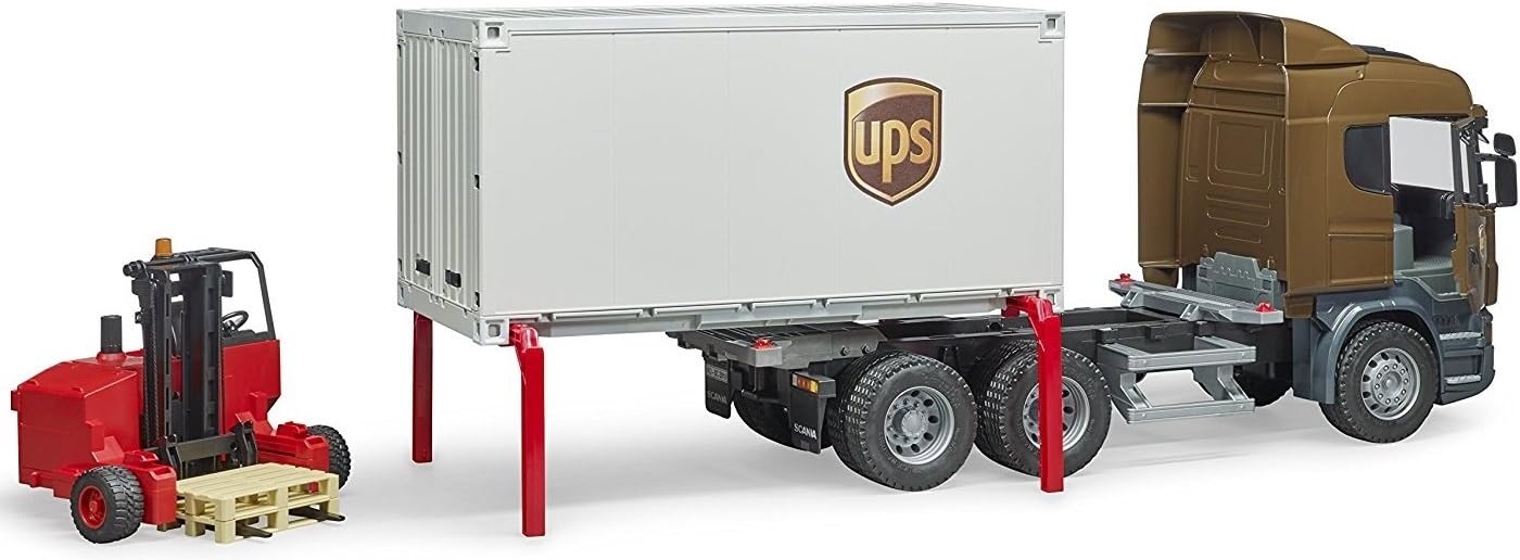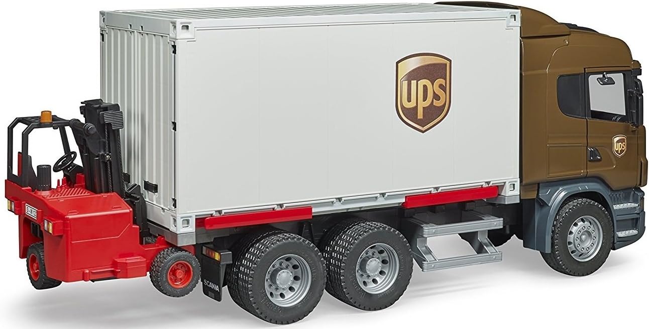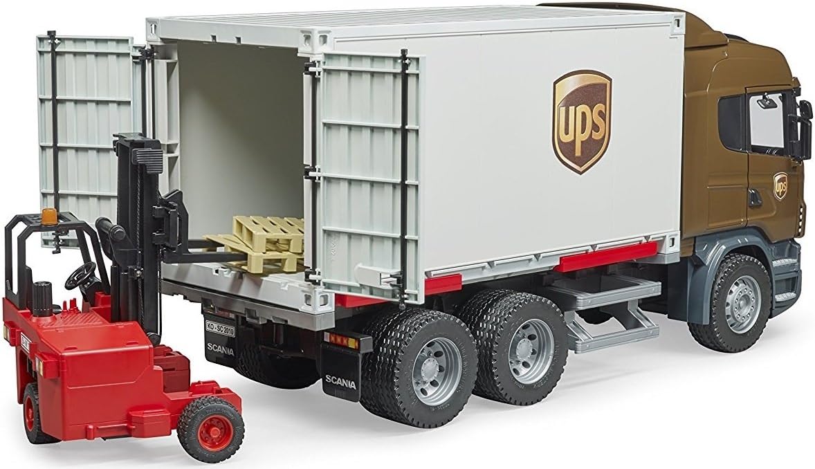 Der Bruder Scania R-Serie UPS Logistik-LKW mit Mitnahmestapler ist ein hochwertiges und detailgetreues Spielzeugmodell im Maßstab 1:16, das speziell für Kinder ab 4 Jahren entwickelt wurde. Es bildet den logistischen Alltag rund um Paketdienste realitätsnah nach.